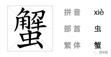 在古人的認(rèn)識(shí)里,蟹屬于水蟲(chóng),或者是魚(yú)的范疇,所以有時(shí)用“蟲(chóng)”旁,有時(shí)用“魚(yú)“旁,就有了“蟹”、“蝌”、“露”幾種寫(xiě)法。